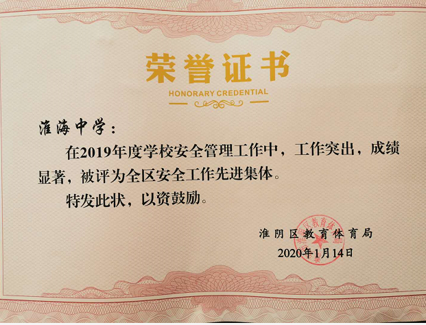 淮海中(zhōng)學喜獲淮陰區2019年度 “安全工(間們gōng)作先進集體(tǐ)”和“禁毒知(zhī)識競賽先進集體(tǐ)機了”