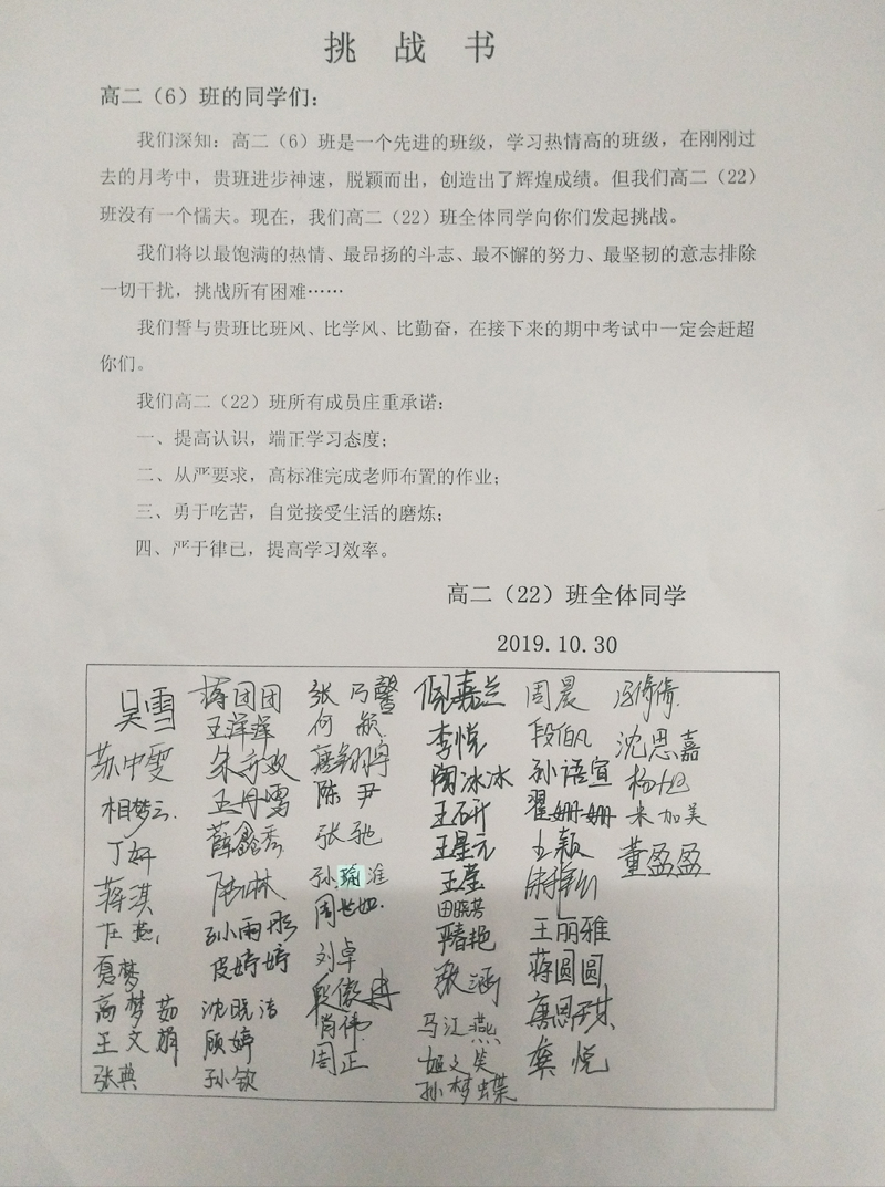 周三的前晚輔導,級部各班級和高二2級部各班級,開(kāi)展了“沖刺車你期中(zhōng)挑戰應戰”活動。各班級挑土我戰應戰的學生(shēng)代表,在宣誓時鬥志(zhì)昂揚,紛紛表示要努力村市拼搏,互相學習,在競争中(zhōng)前進。間愛 (周雲田)