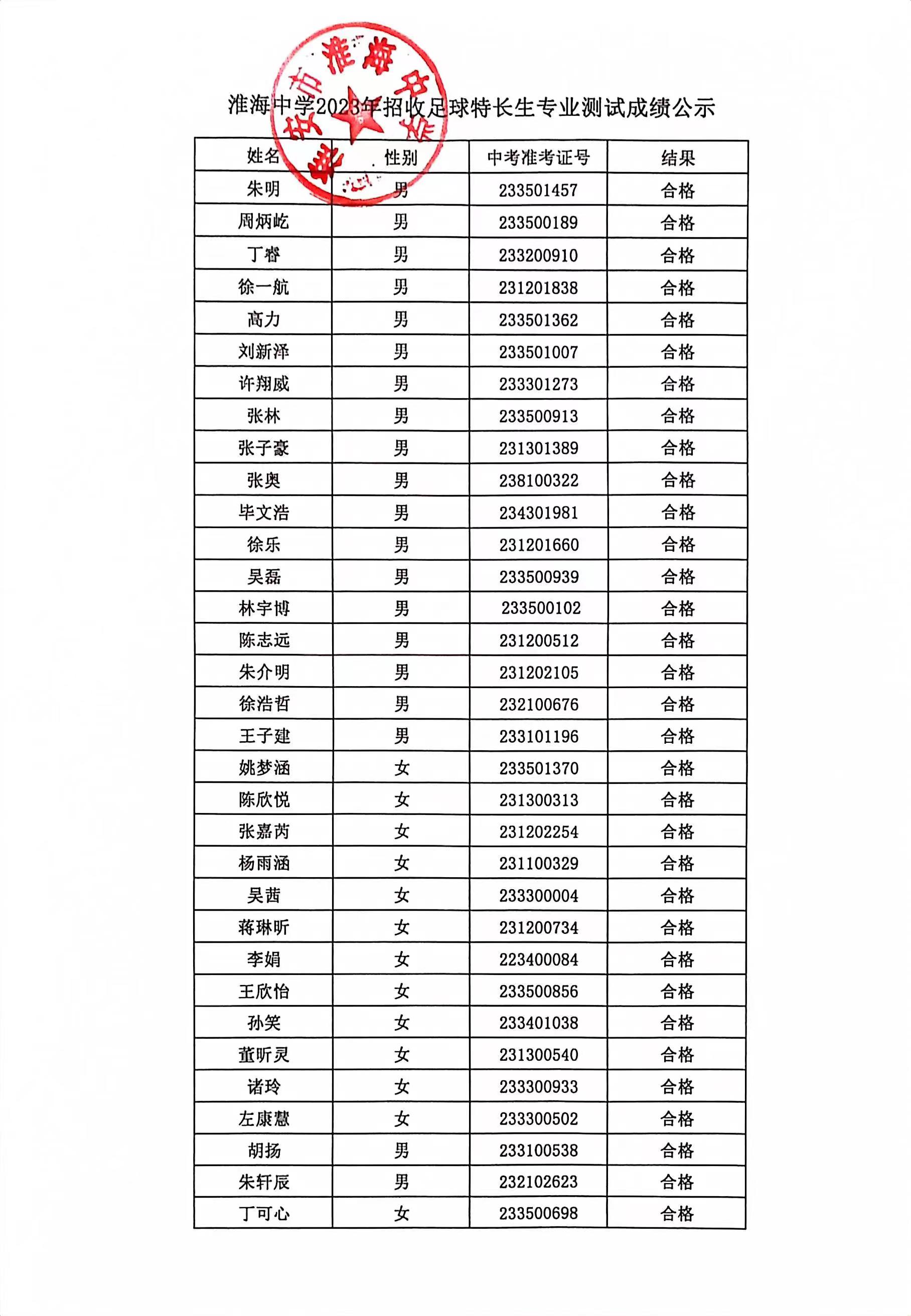 淮海中(zhōng)學2023年招收足球特長生(shēng)專業測麗時試成績公示